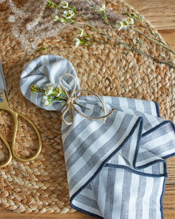 Complétez la décoration de table avec des serviettes en coton. Consultez notre tutoriel de pliage de serviettes pour inspiration et terminez le look en y attachant quelques petites branches. Enfin, profitez d'un agréable moment ensemble.
